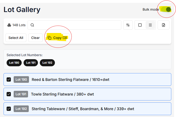 You can also turn on Bulk Mode to Copy lots from one auction to another (useful to combine auctions or split large auctions).