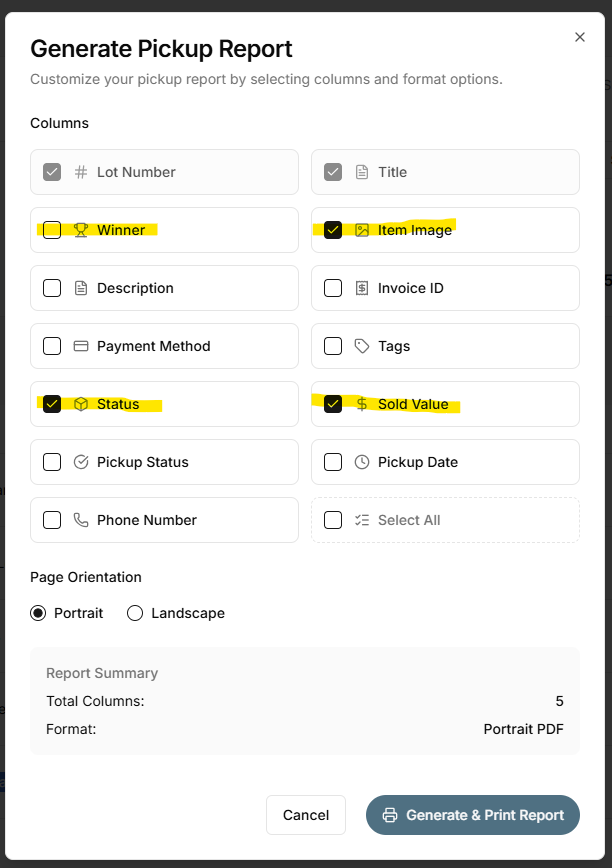 - If clients want a report with pictures, go to "Settlement and Reports" and get "Pickup Report by Invoice with Images", uncheck Winner name and check Image, Status and Sold Value