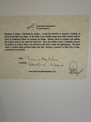Professional photographer depiction of the Northern Lights , Gransfjord, Norway. On the back is his description of the work. Signed but not dated, production by Four Crows Photography . Visit fourcrowsphotography.com for more information about David Mangels. Picture size is 19.75”wide, 15.75” tall . Frame size is 24”wide, 20” tall.