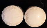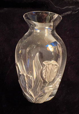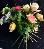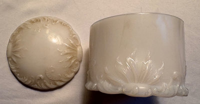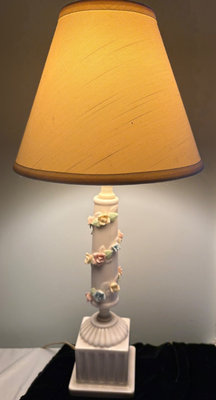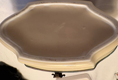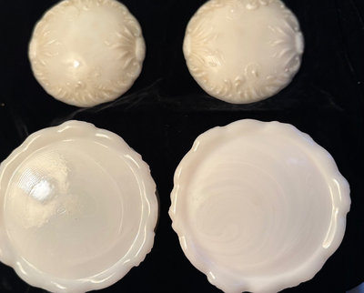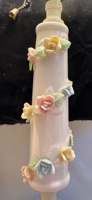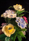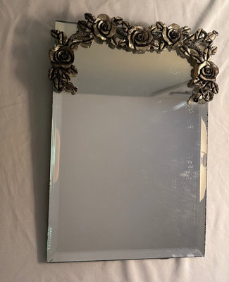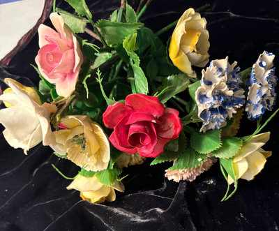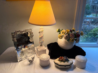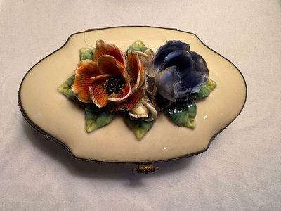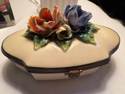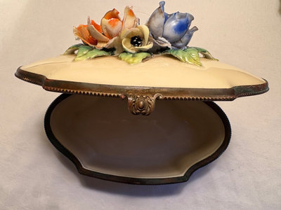 Copadimonte ( not stamped) porcelain trinket box with brass trim . 2 Victorian milk glass trinket boxes , 16 handmade ceramic flowers in a pottery vase . Small glass vase with pewter flower overlay , standing vanity mirror with silver plated flower design.