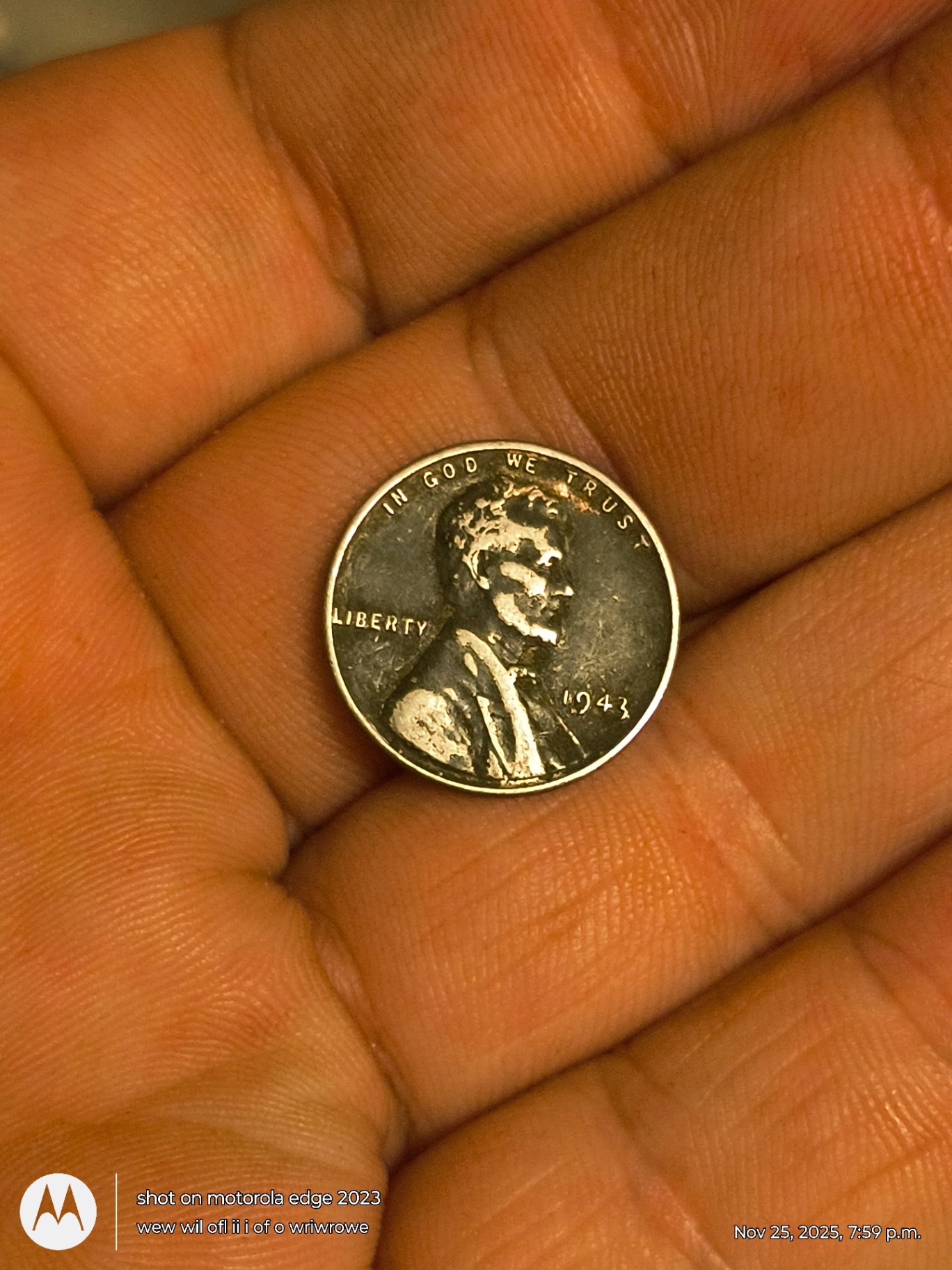 A 1943 United States Lincoln cent showing Abraham Lincoln on the obverse and the reverse design with the inscriptions ONE CENT UNITED STATES OF AMERICA.