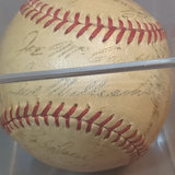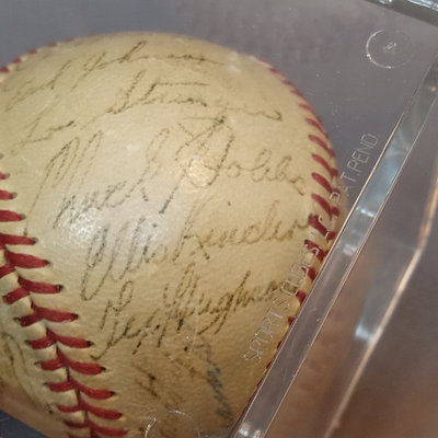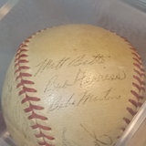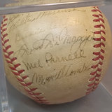 Baseball featuring signatures of 1949 Boston Red Sox players. 25 signatures - Johnny Pesky, Bill Goodman, Walter Masterson, Birdie Tebbetts, Dom DiMaggio, Mel Parnell, Merrill Combs, Matt Batts, (Dave) Boo Ferriss, Babe Martin, Joe McCarthy (manager), Ted Williams, Joe Dobson, Earl Johnson, Lou Stringer, Chuck Stobbs, Ellis Kinder, Tex Hughson, Bob Doerr, Al Zarilla, Bill Hitchcock, Vern Stephens, Jack Kramer, Tommy O'Brien, and Frank Quinn. Unauthenticated. 1 piece.