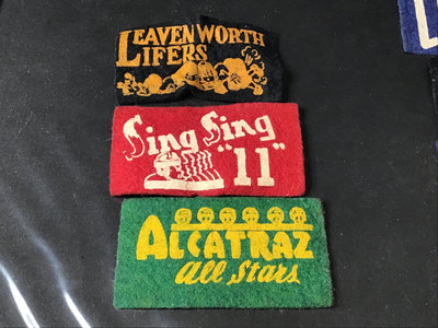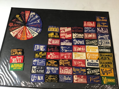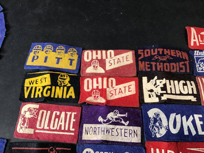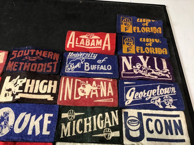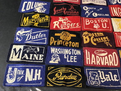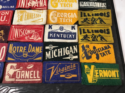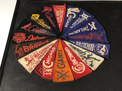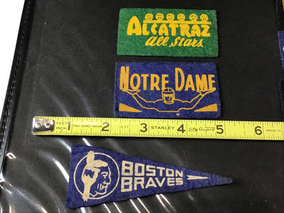 Mini felt pennants from era 1930s-early 1950s. Triangle Major League Baseball team pennants, including the now-defunct Brooklyn Dodgers, Washington Senators, Boston Braves, NY Giants, Philadelphia Athletics. Rectangular Prison Football pennants for Leavenworth Lifers, Sing Sing "11" and Alcatraz All Stars. College football pennants for the Ivy Leagues and more, some duplicates. Some dirt/wrinkling from age and storage. 67 pieces.
