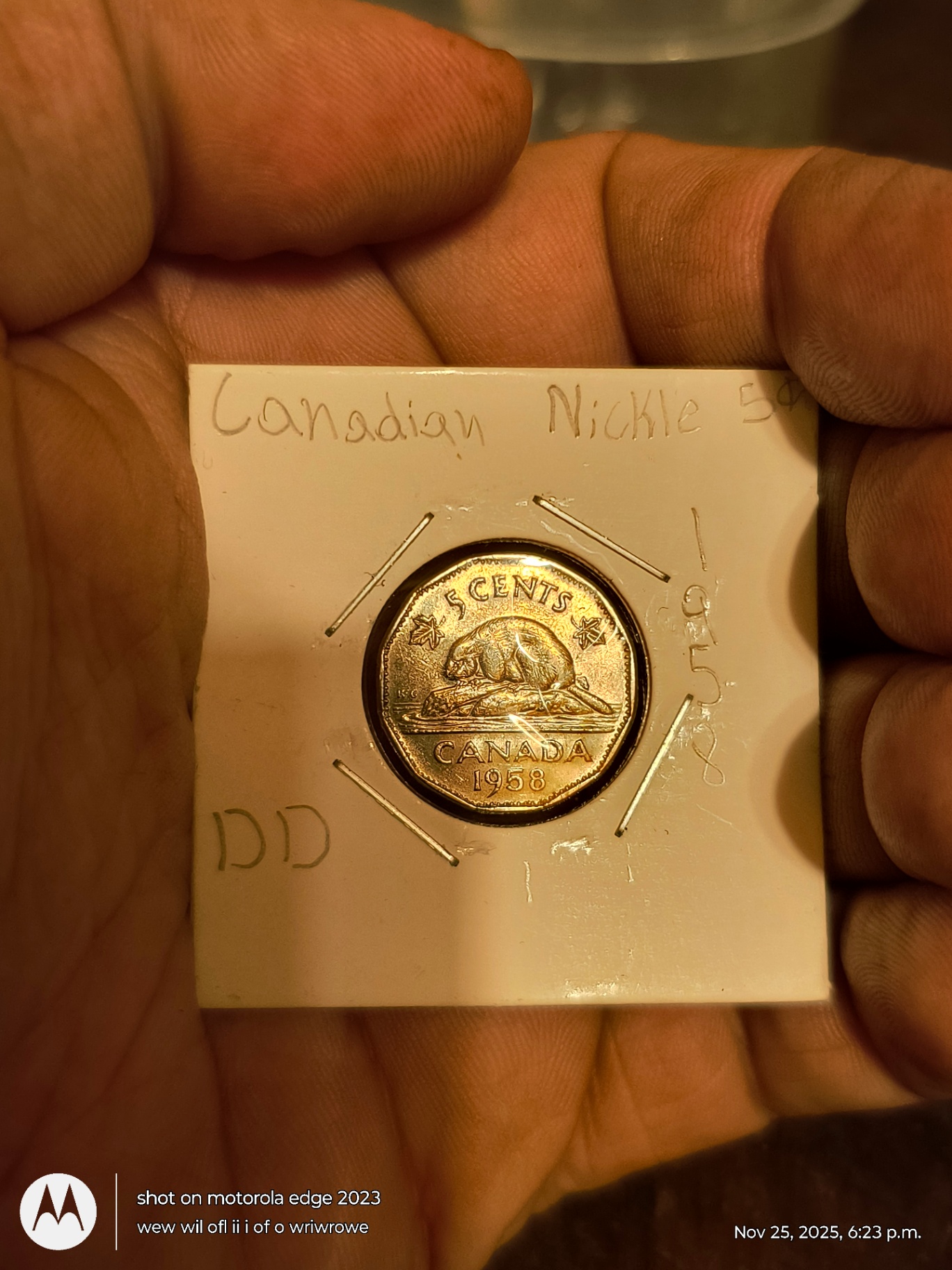 Canadian five-cent coins (nickels) dated 1958; one shows the beaver on the reverse and the other bears the obverse portrait of Queen Elizabeth II.