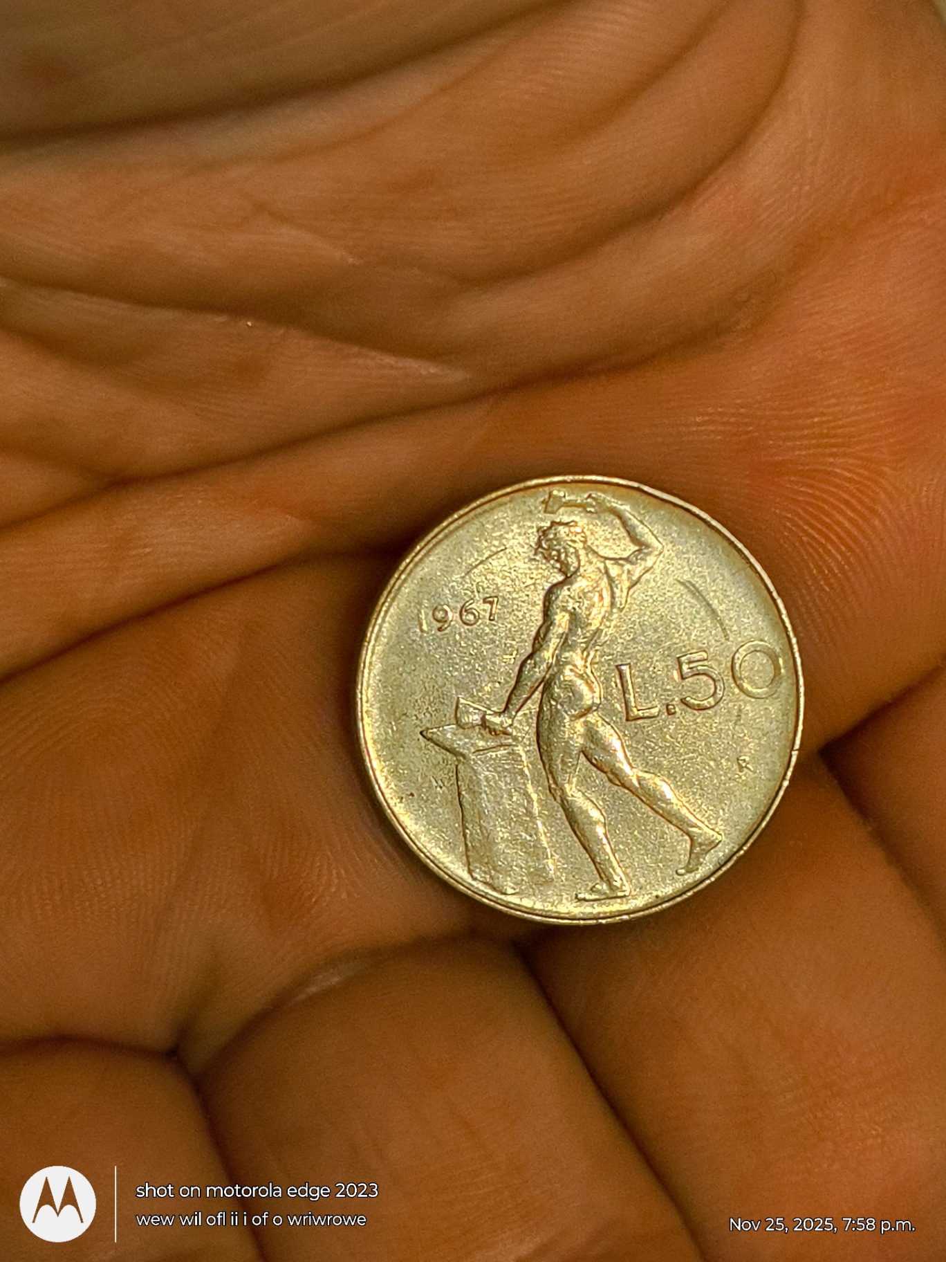 A silver-colored coin dated 1967, with the denomination L50, depicting a male figure standing beside an anvil and hammer.