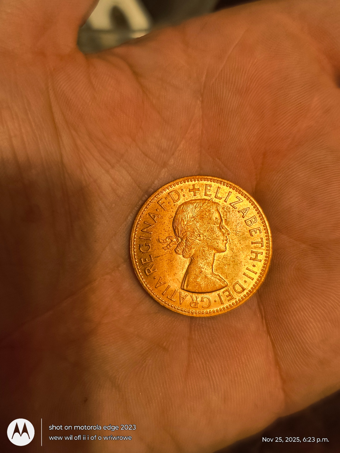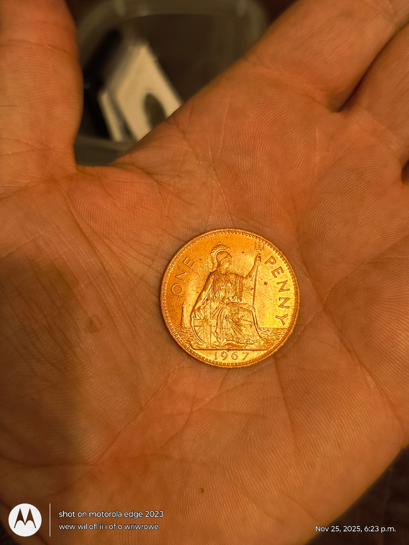A copper British one penny coin from 1967, featuring Queen Elizabeth II on the obverse and Britannia on the reverse.