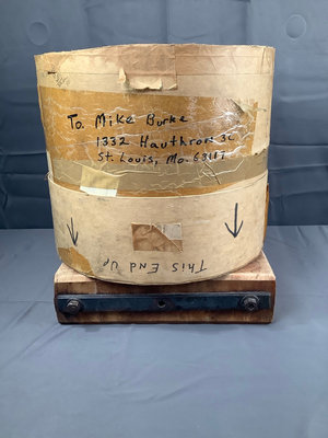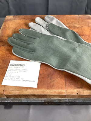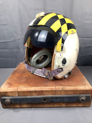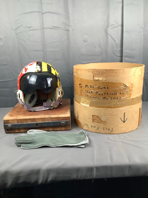 Fighter Pilot helmet from the 1970s. Damaged earmuffs and worn padding. Wear consistent with change. Sheepskin flying gloves and haberdasher’s box to hold it. 3 pieces.