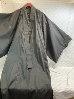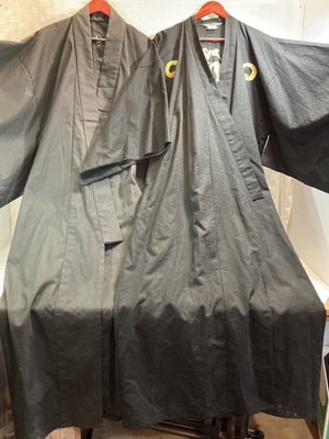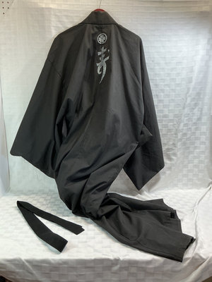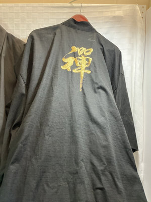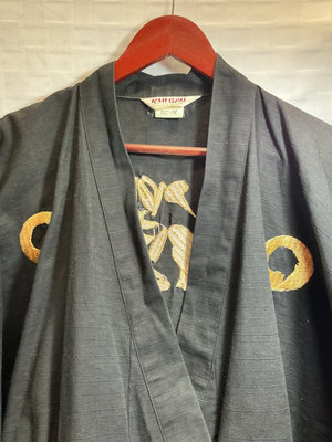 A black traditional Japanese kimono-style kimono with wide sleeves featuring gold embroidery: a Zen kanji character on the back and a gold crest motif on the front, with a matching belt sash.