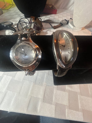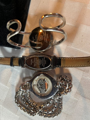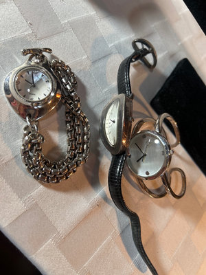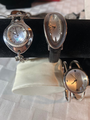 The one with the leather band matches jewelry in lot #20, the one with chains band is missing it’s back, and the third does not have any give in it so it either fits your wrist or not. More info on Robert Lee Morris watches here: https://www.ebay.com/b/Robert-Lee-Morris-Watches/31387/bn_5720383