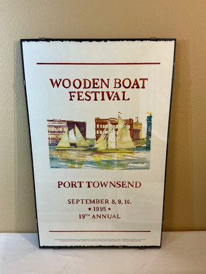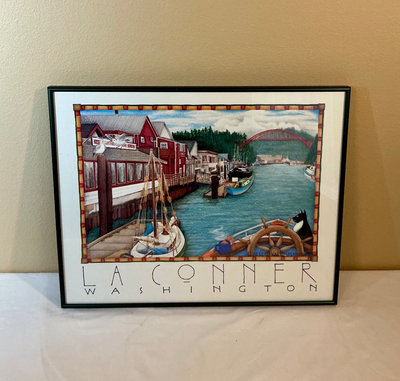 The posters of La Conner and the San Juan Islands are both 16” x 20”, Wooden Boat Festival, 14” x 23”, and photo of Orcas, 18” x 22”.