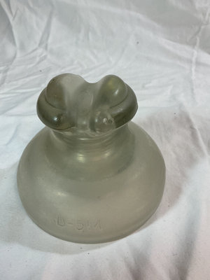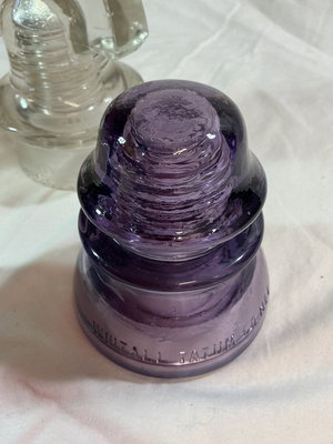 A collection of four insulators, clear glass with a winged top, purple glass, teal and a large frosted glass one