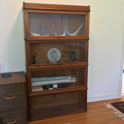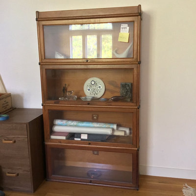 Vintage Macey barrister's bookcase. 4 sections plus top, no base. All Macey 912, finish 9. Some wear. 34x11x66.5. CONTENTS NOT INCLUDED. Heavy, bring help and appropriate vehicle to pickup. 5 pieces.
