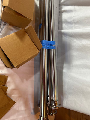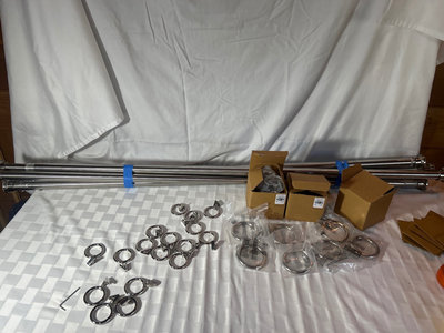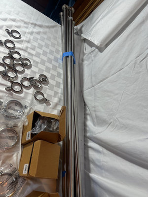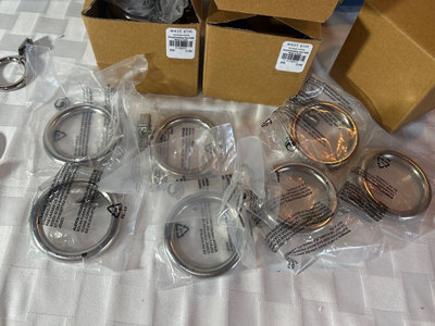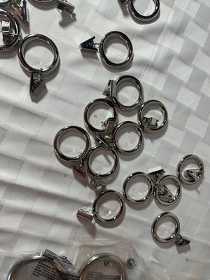 Five 4 feet Chrome curtain rods that slightly expand. There are 17 1” Chrome curtain rings with hooks that do not fit on these rods. There are 3 boxes containing 21 2” Chrome rings that do. Comes with a tiny allen wrench to adjust.