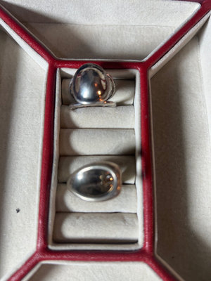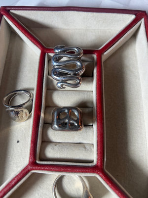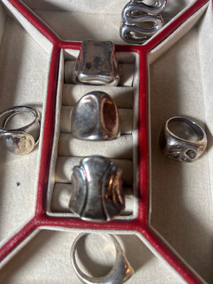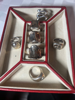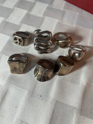 From Robert Lee Morris of NY, here are 7 of his signature sterling rings. https://robertleemorrisgallery.com/. These are likely a range of sizes worn on different fingers, but no sizing available.
