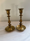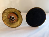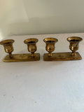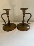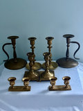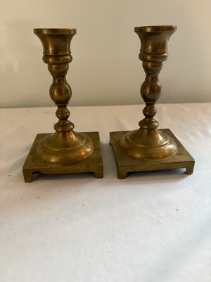 2 colonial chamberstick holders with large finger loop. 2 antique square bottom sticks , 2 potentially late 19th century sticks , 7.5” tall with large drip plate . 2 small vintage pair , $31 on bottom