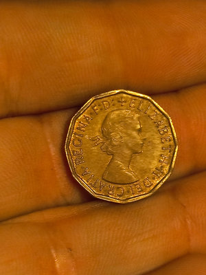 a twelve-sided coin with a lattice-like central motif and a crown on the reverse, dated 1966, and a smaller obverse coin featuring the portrait of Queen Elizabeth II with the inscription 'ELIZABETH II D.G. REGINA' around the edge.