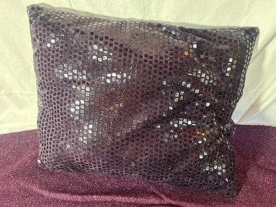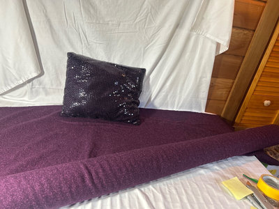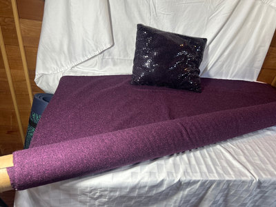 The bolt of fabric is a wool blend and was used as upholstery. It is 58” wide and approximately 2 1/2 yards left on bolt. Comes with a purple mesh sequined pillow.