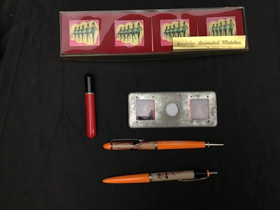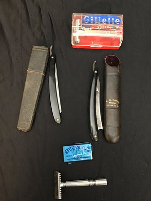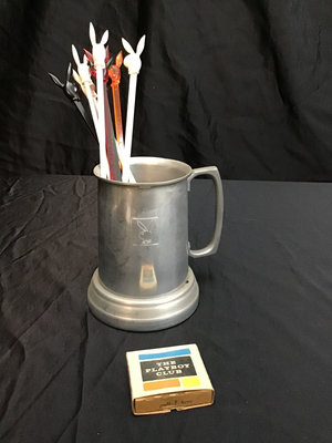 Vintage Playboy Club items including January 1974 20th Anniversary issue of Playboy Magazine, aluminum tankard, stirring straws, peep show plate, key. Strait razors. Cigar paraphernalia, including cigar box, cigar cutters, and ashtrays. Sheik condom tin, original wrapper and paper still inside, rubber either used or disintegrated over time. And more. 30 plus pieces.