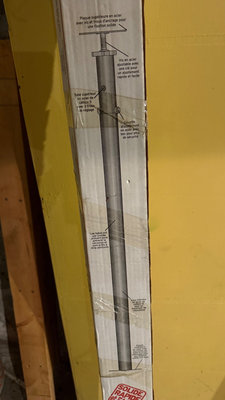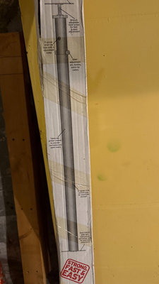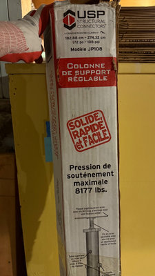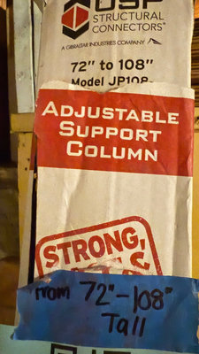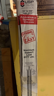 A boxed adjustable steel support column with printed specifications and diagrams. Model JP108, height range 72 to 108 inches, maximum load 8177 lbs, branded by USP Structural Connectors.