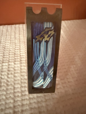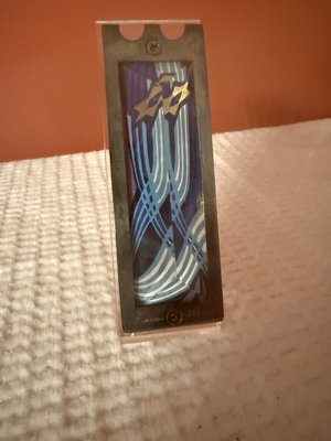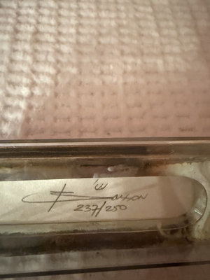 A black-framed rectangular glass art panel displaying blue and white flowing wave patterns with gold angular shapes. The piece is a limited edition, numbered 237/250.