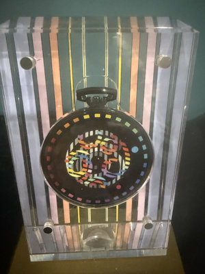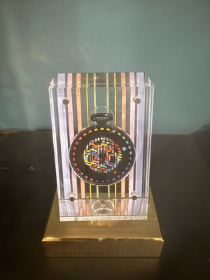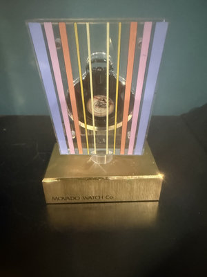 A clear acrylic block sculpture with vertical pastel and metallic stripes surrounding a central circular dial of multicolored geometric patterns, mounted on a gold base inscribed with 'MOVADO WATCH CO' and 'AGAM'.