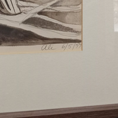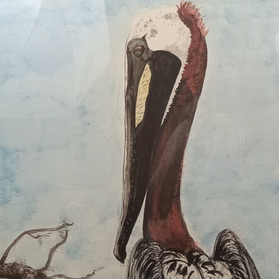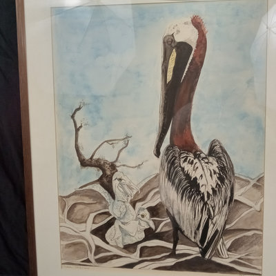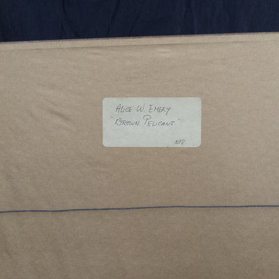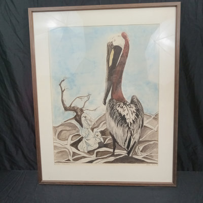 Alice W. Emery (American contemporary), often signing her work as Ali or Ali Web. "Brown Pelicans 6/5/77" signed in pencil at the bottom. Art 22x15.75, frame 28.25x22.5. 1 piece.