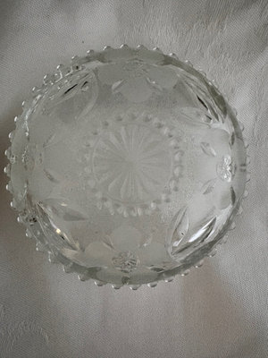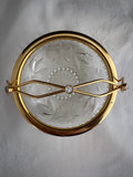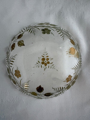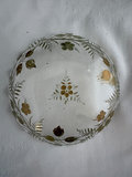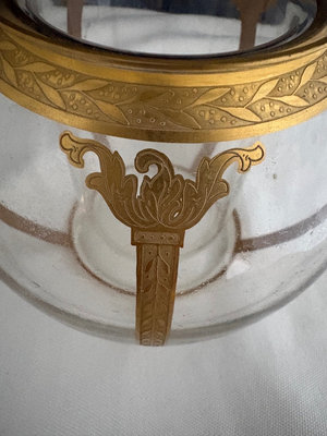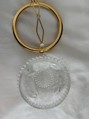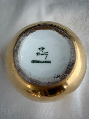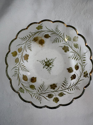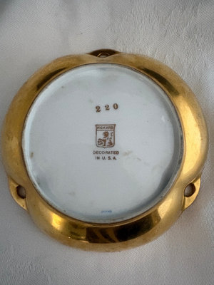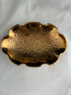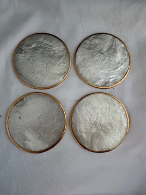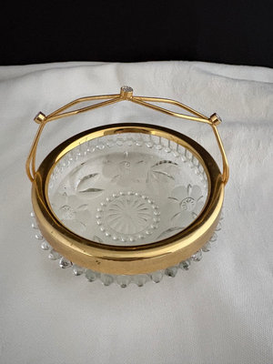 22k gold leaf votive holder , Napoleon style, ArtNouveau "Henkelkorb" (handle basket) with a glass insert, is Argentor, designed by Hans Ofner around 1900-1910. Pickard vintage porcelain China floral etched candy dish, Holley Bros . 22 k gold dish, Glass gold painted Goofus Glass dish for trinkets or candy . Set of five round mother-of-pearl or capiz shell coasters with a gold-toned metal rim. ( picture was taken without 5th one)