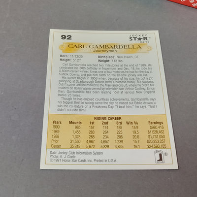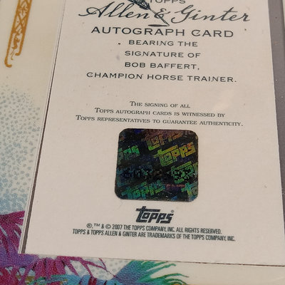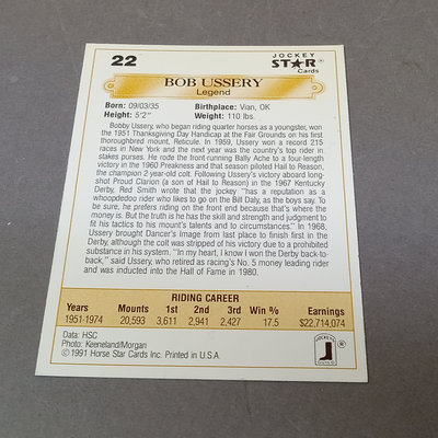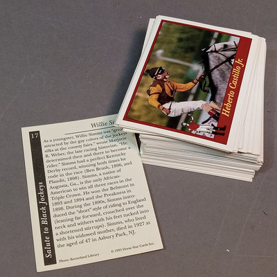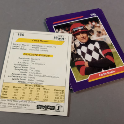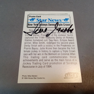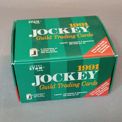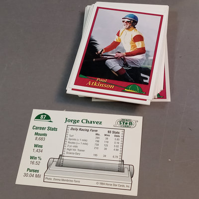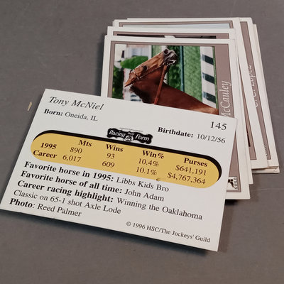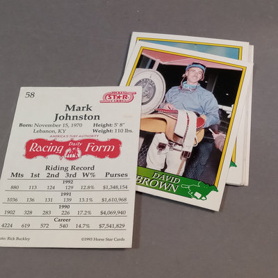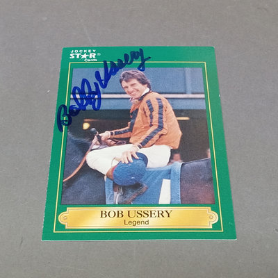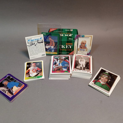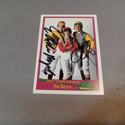 Jockey collectable trading cards. Allen & Ginter Autograph Card, Topps 2006, signed by Bob Baffert, champion horse trainer, encased. Guild Trading Cards 1991 box set, unvetted for completeness, plus signed #22 Bob Ussery. 1993 Triple Crown Jockeys Promo Card, signed on front/back with 3 signatures. Extras from 1992, 1993, 1994, 1995, and 1996 sets. 5 plus pieces.