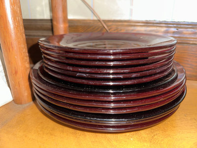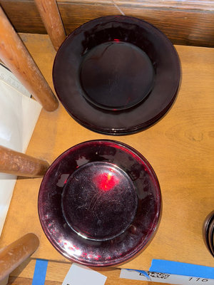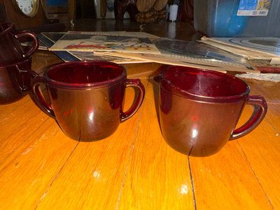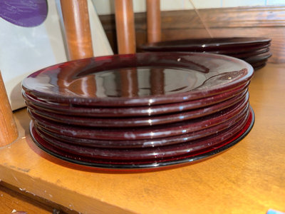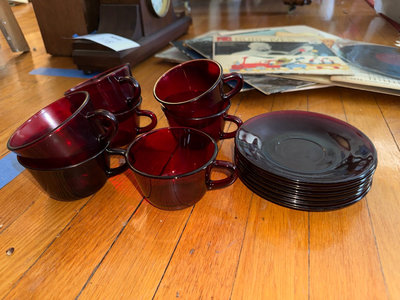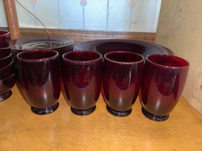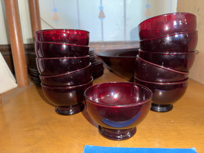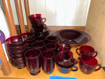 A collection of cranberry colored glass tableware including multiple cups with handles, small bowls, tall goblet-style glasses, and several stacks of plates and a large shallow serving bowl.