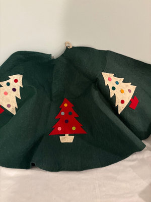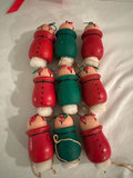 Handmade felt tree skirt , wooden pillar holder , MrsClaus votive holder, wooden Merry Christmas candle holder with 2 vintage snowman candles, 9 handmade wooden elf’/ gnome figure ornaments., Victorian glass bulb, felt figures and other decorations .