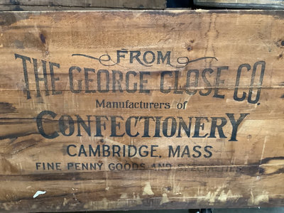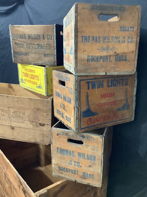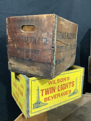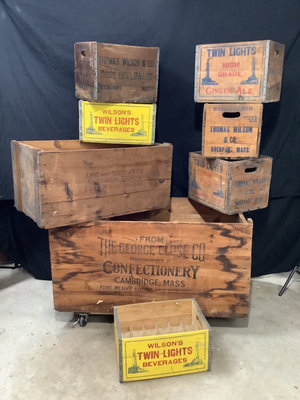 Wilsons Twin Lights beverages, George Close Co. Confectionery, and Perishables, wooden crates. Largest 48x24x24 smallest, 18x10x12. 8 pieces.
