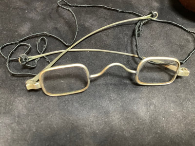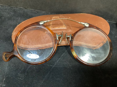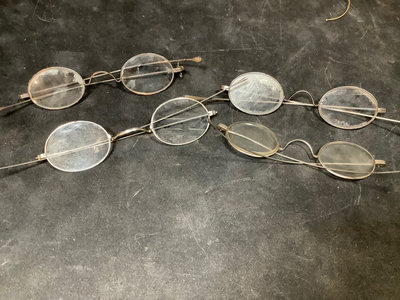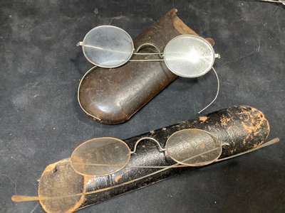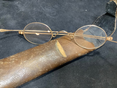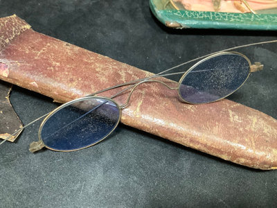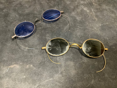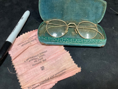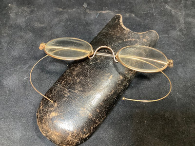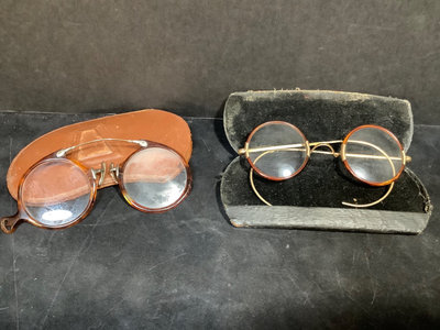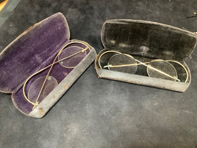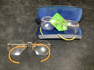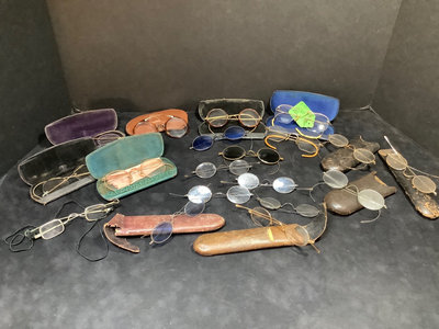 Collection of prescription glasses, several with tinted lenses, in cases and without. Several pairs missing screws, several rolled gold frames, two pairs of bifocals from the 1950s. Most cases are dry/cracking from age and storage. 19 pieces.