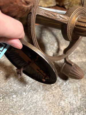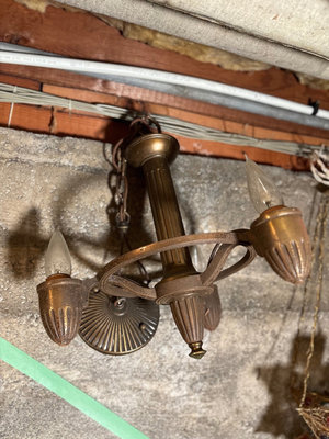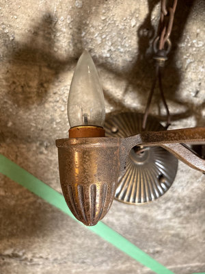 Vintage brass ceiling chandelier with a central column and circular arm supporting several acorn-shaped bulb housings, each containing a candle-style light bulb. 12 x 16"