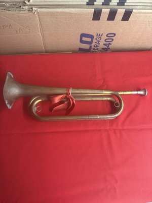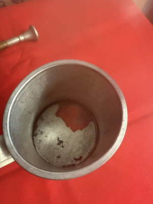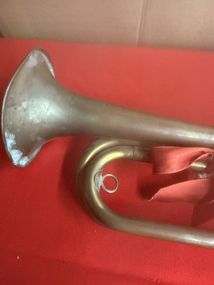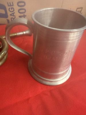A collection of tarnished metal items including an antique brass trumpet with coiled tubing and a red ribbon, a pewter tankard with engraved pattern, a perforated metal ball/infuser claw bell with decorative cutouts, a pewter mug, and several small metal fittings.
