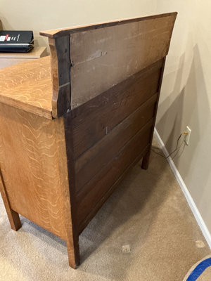 Antique oak buffet with an attached rectangular mirror, featuring two small top drawers, additional drawers, and a lower cabinet with two doors and a central divider. It is 42 inches wide, 20 inches deep and 45 inches tall.