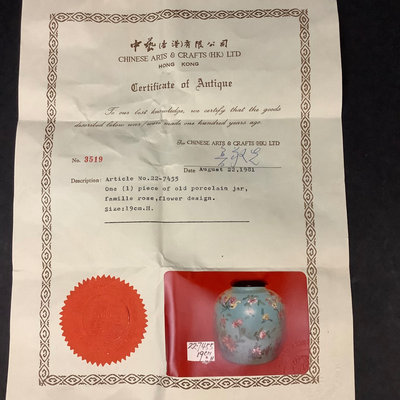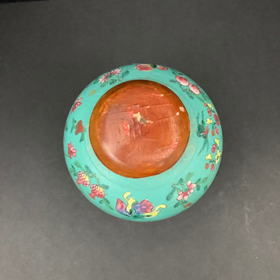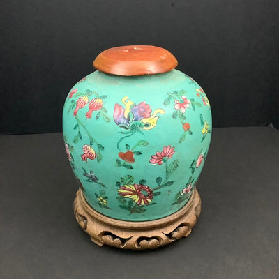 Antique Famille Rose ginger jar with wooden lid, lacquer peeling, certified antique, purchased in Hong Kong. 7.25dx7.5h. Some wear on top rim. No mark on bottom. Includes wood stand. 3 pieces.