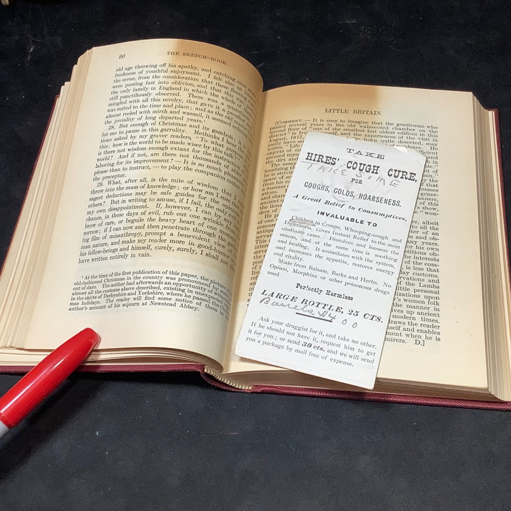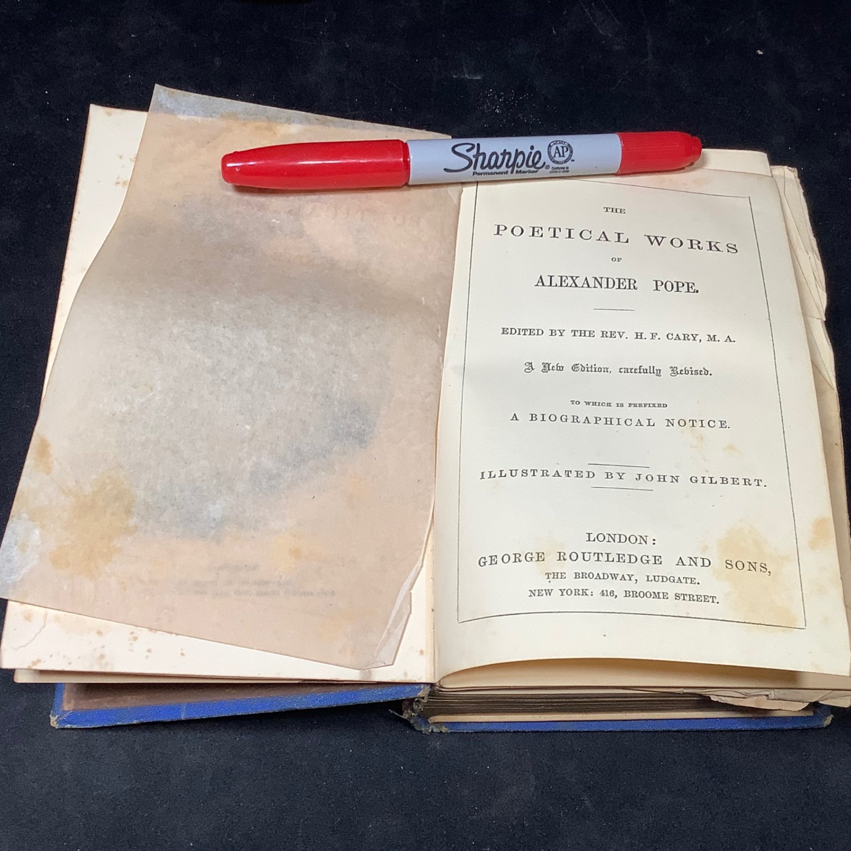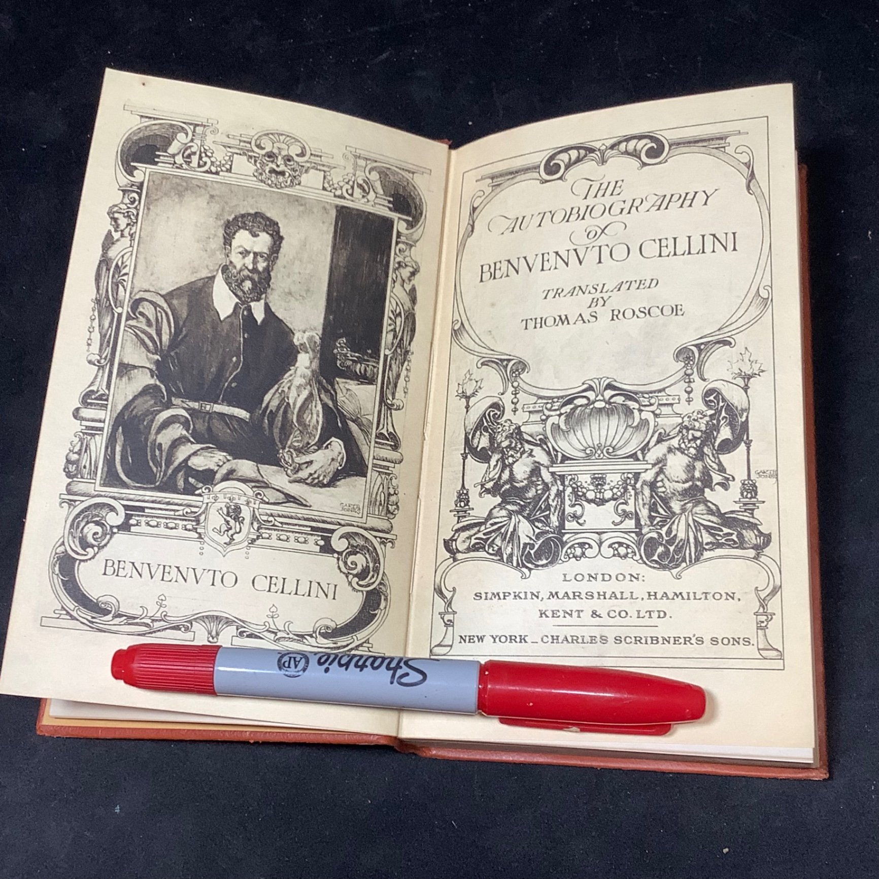 Leather bound, stamped, and colored The Poetical Works of Alexander Pope, M.A., George Routledge and Sons, gilt edge with a section falling out. Leather bound Idylls of the King by Alfred, Lord Tennyson, Thomas Y. Crowell Company Publishers. Leather bound Autobiography of Benvento Cellini, trans. Thomas Roscoe, Charles Scribner's Sons, New York. MacMillan Red Pocket Classics - Keary's Heroes of Asgard 1904 and Dickens' A Tale of Two Cities 1906, Tan Pocket Classics - Thackeray's Henry Edmond 1907 and Stevenson's Kidnapped 1914.Sir Roger De Coverley Papers, 1898. Shakespeare's Tragedies. Brian by Yorke. The Sketch-Book by Irving, 1907. Select Poems of Robert Burns, 1905. Stowe's The Pear of Orr's Island. Leather bound The Collected Verse of Edward A. Guest, 1936. Adjustable metal book holder. 16 pieces.