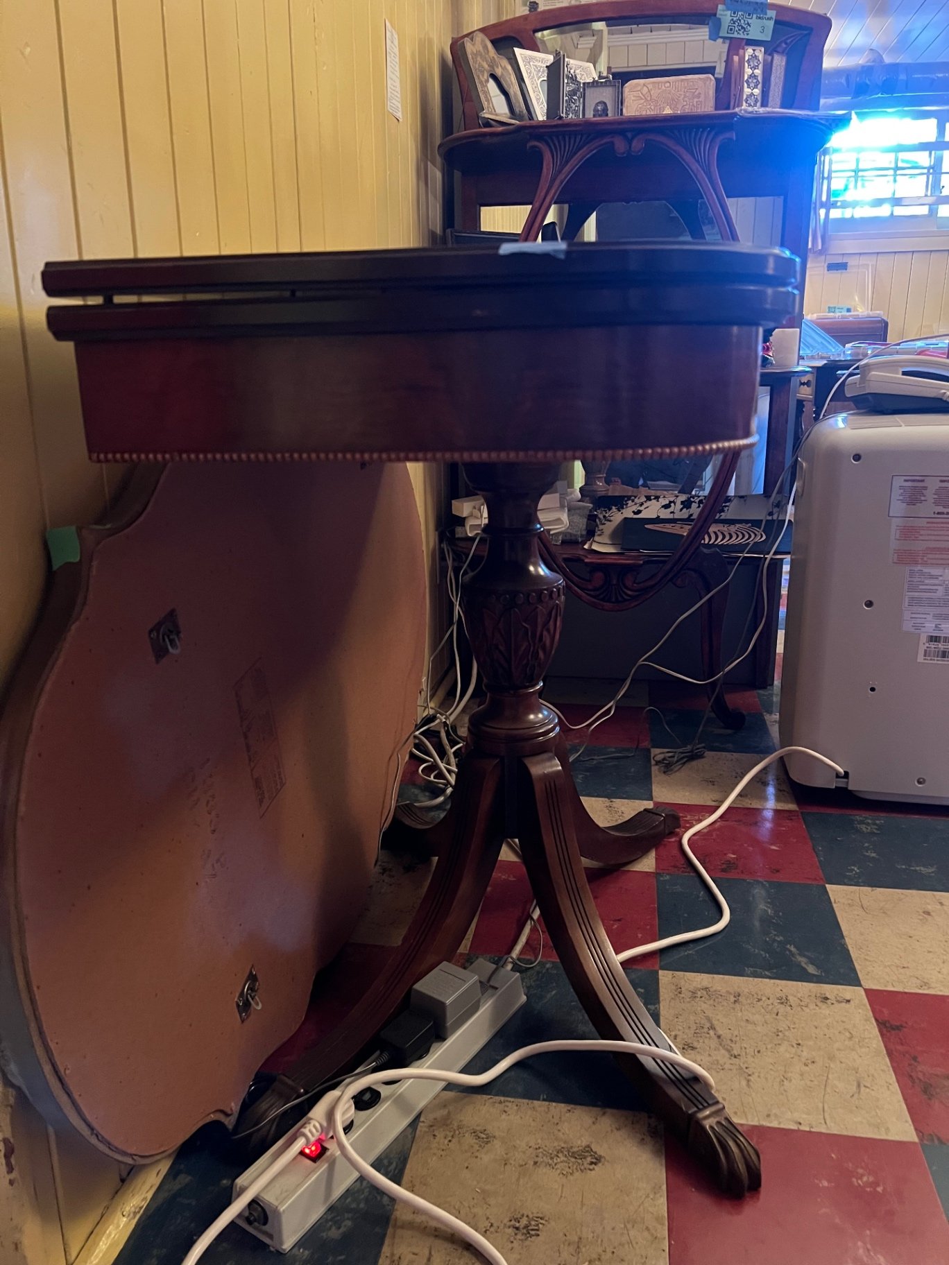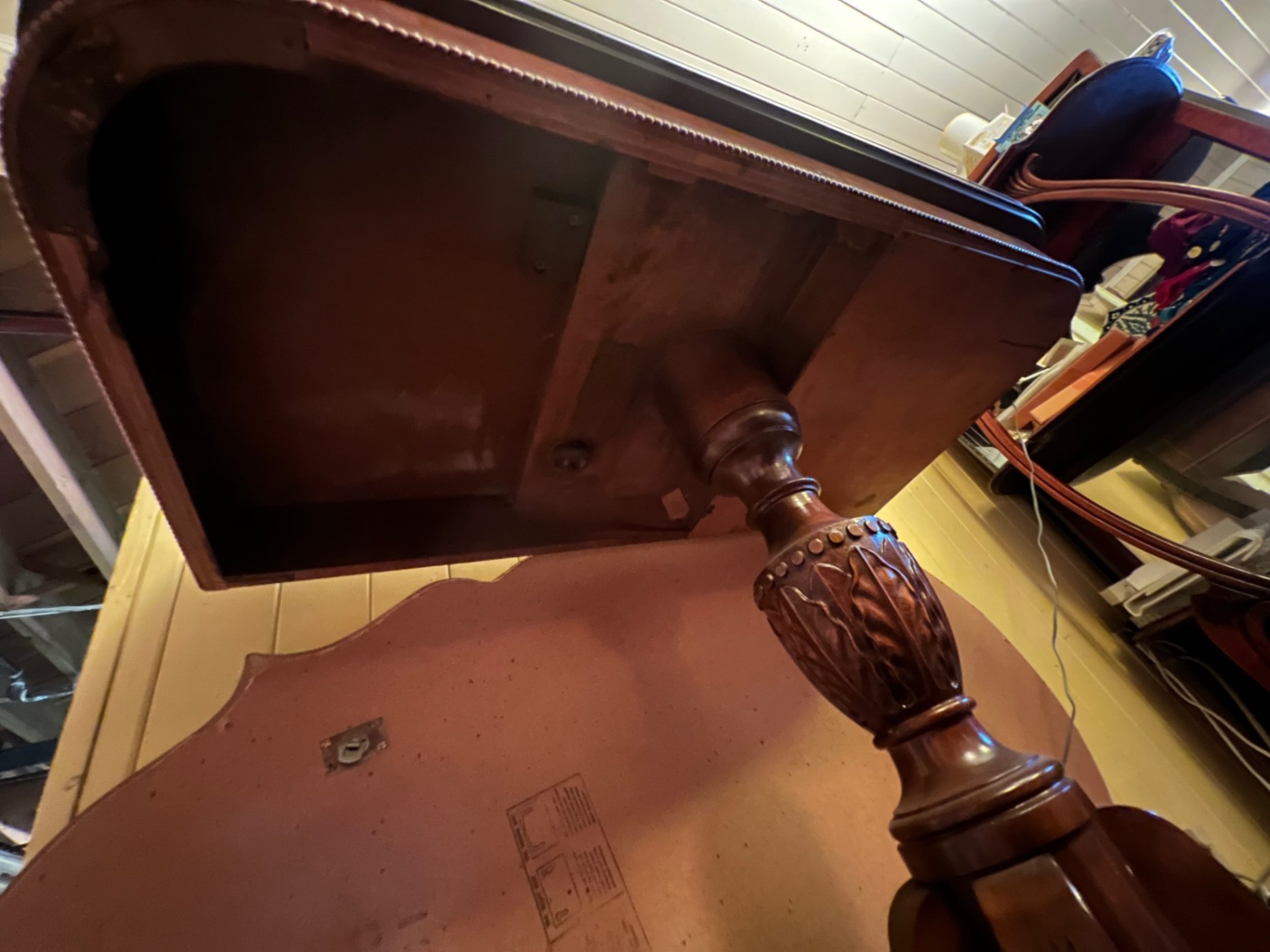Wooden dining table with a polished mahogany finish, a central carved pedestal base, four curved legs with claw foot design, bead trim along the apron, fold-over table top and dimensions of 36 in W x 18 in D x 30 in H.