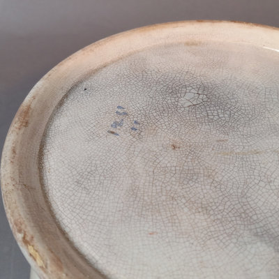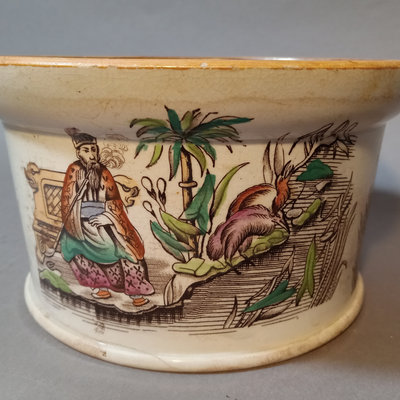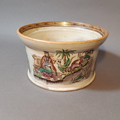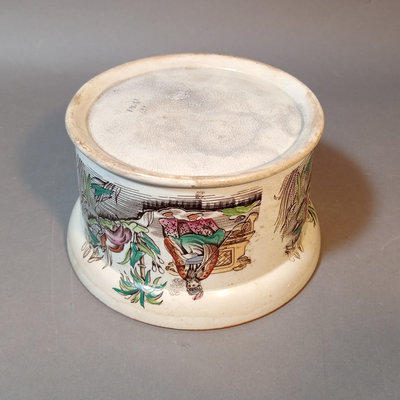 Antique Chinoiserie design ironstone bowl, similar in style to Beech & Hancock. Possibly used as a decorative plant holder. Crazing/discoloration consistent with age and use. Unmarked. 7.5d x 4.25h. 1 piece.