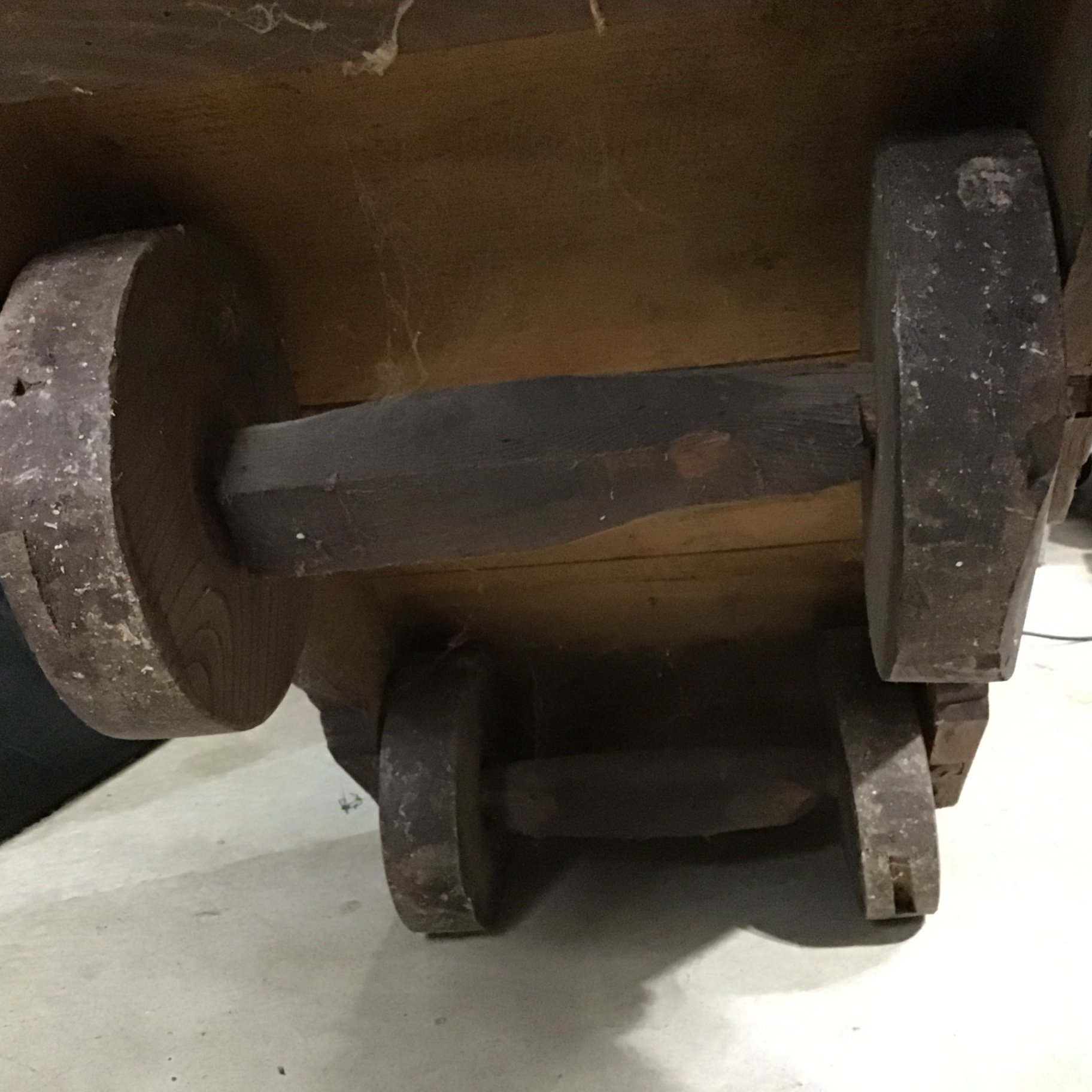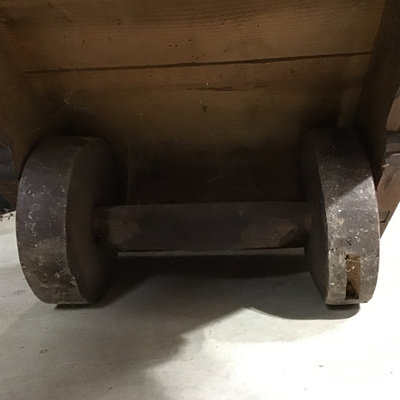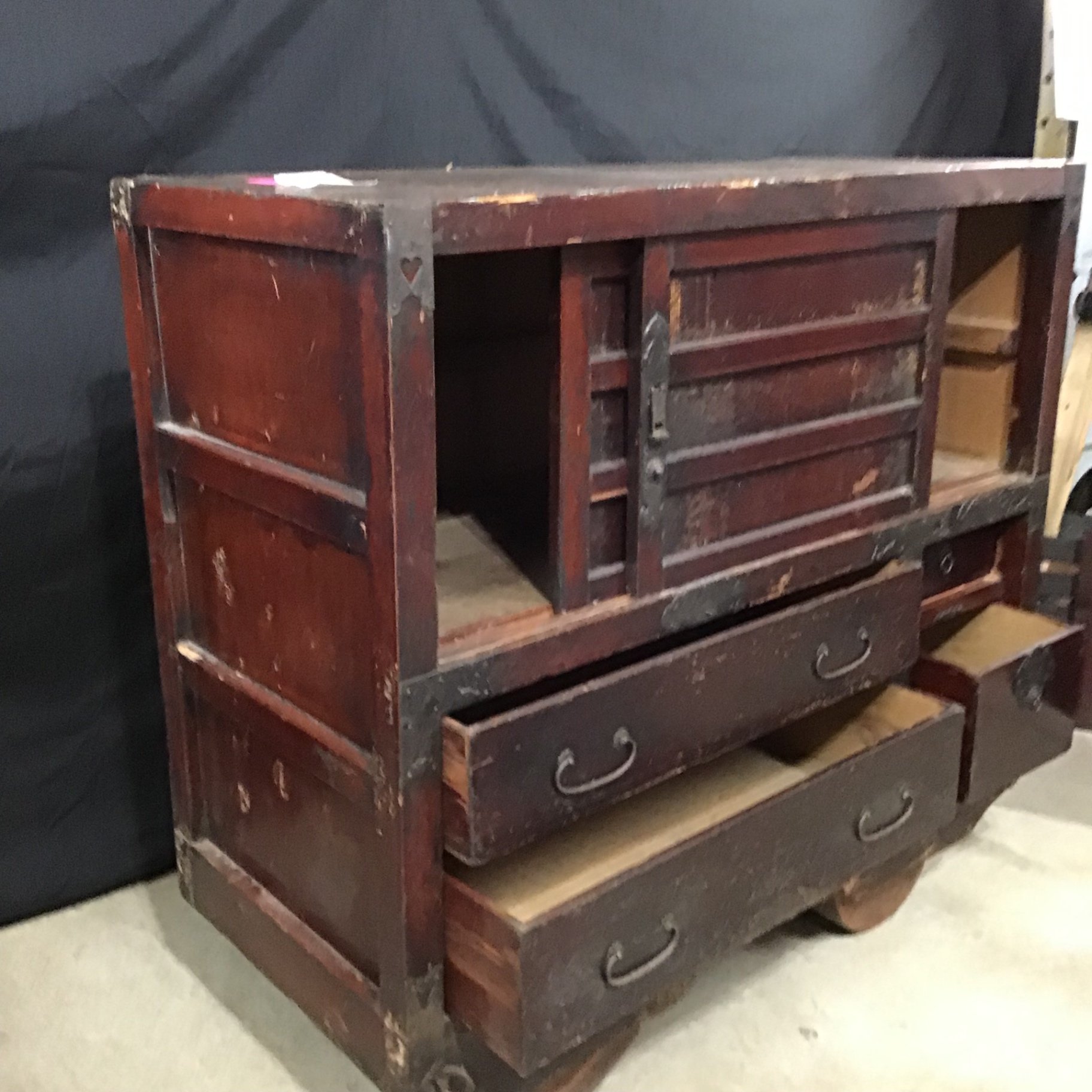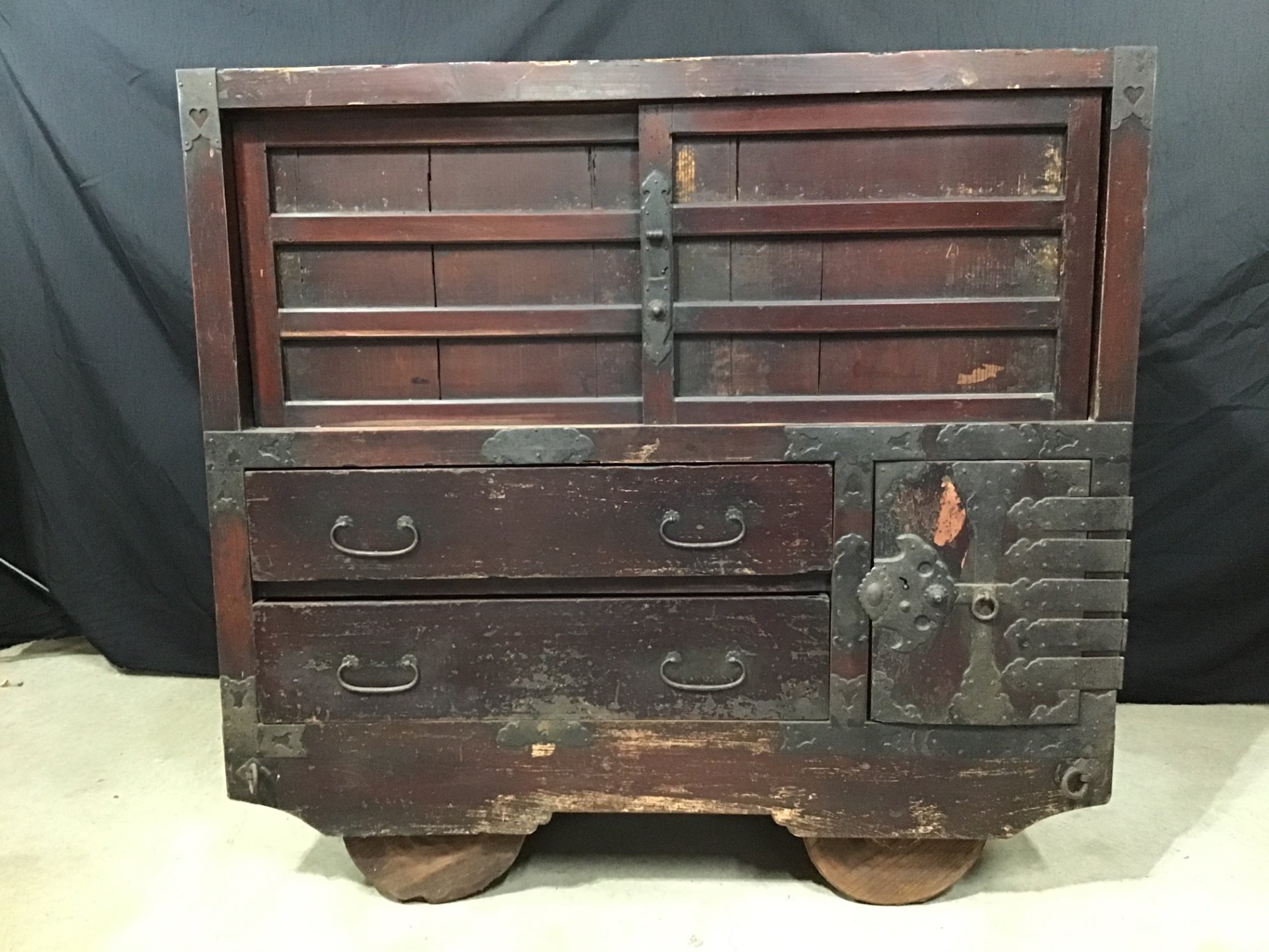 Antique wood Tansu / chest, with large wooden wheels underneath for movement. 48x18x36. Heavy, bring help and appropriate vehicle to pickup. 1 piece.
