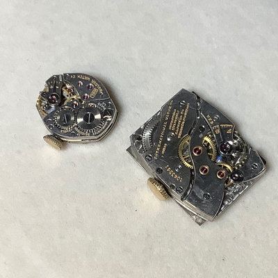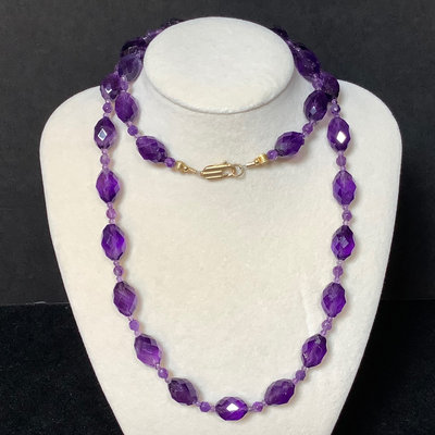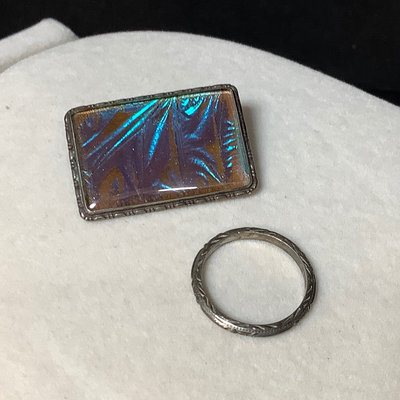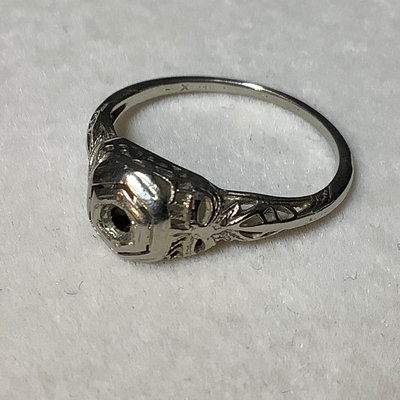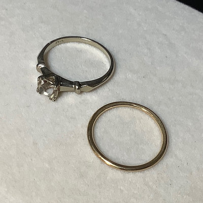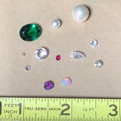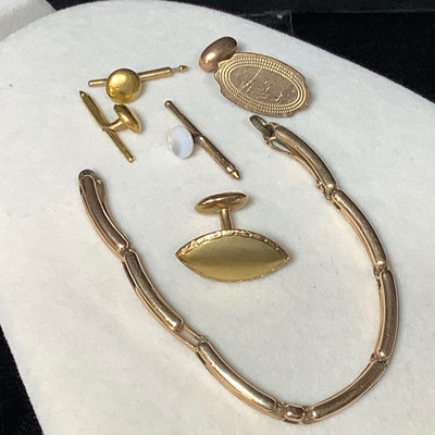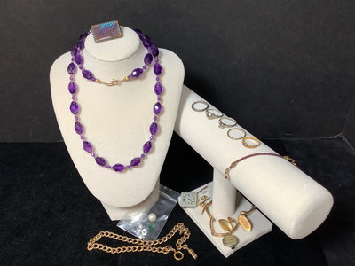 Functional jewelry and several repair pieces. 26in amethyst bead necklace with 14k gold clasp, scrapes and nicks on several beads. Sterling foil under glass brooch, and Size 6 sterling wedding band, overall 5.0dwt. Size 6 18k white gold engagement ring, no stone, stamped 18 and acid tested, 1.1dwt. Size 6 white gold 14k stamped engagement ring, no stone and size 6 yellow gold 14k acid tested, overall 1.8dwt. Gold plated bracelet extender with tiny garnet beads, tiny ring missing stones, mismatched cufflinks, watch band, pocket watch chain, and more. Watch faces for a ladies Bulova and Bigelow. Miscellaneous faceted loose stones, including a heart shaped amethyst, various sized clear stones, cabochon black opal, and more. 15 plus pieces.