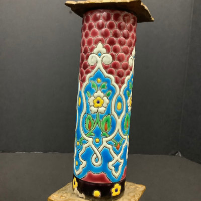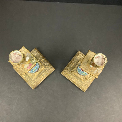 Pair of antique Longwy cloisonné patterned earthenware over brass candle holders, 10h x 4sq base. Minor chips on bottom of one. Unmarked. 2 pieces.