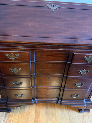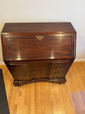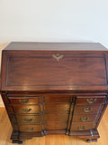 A large antique mahogany slant-front desk that includes an upper storage section with small cubbies and drawers and a base with multiple drawers on both sides; features brass hardware and carved lower feet. 36x13x38