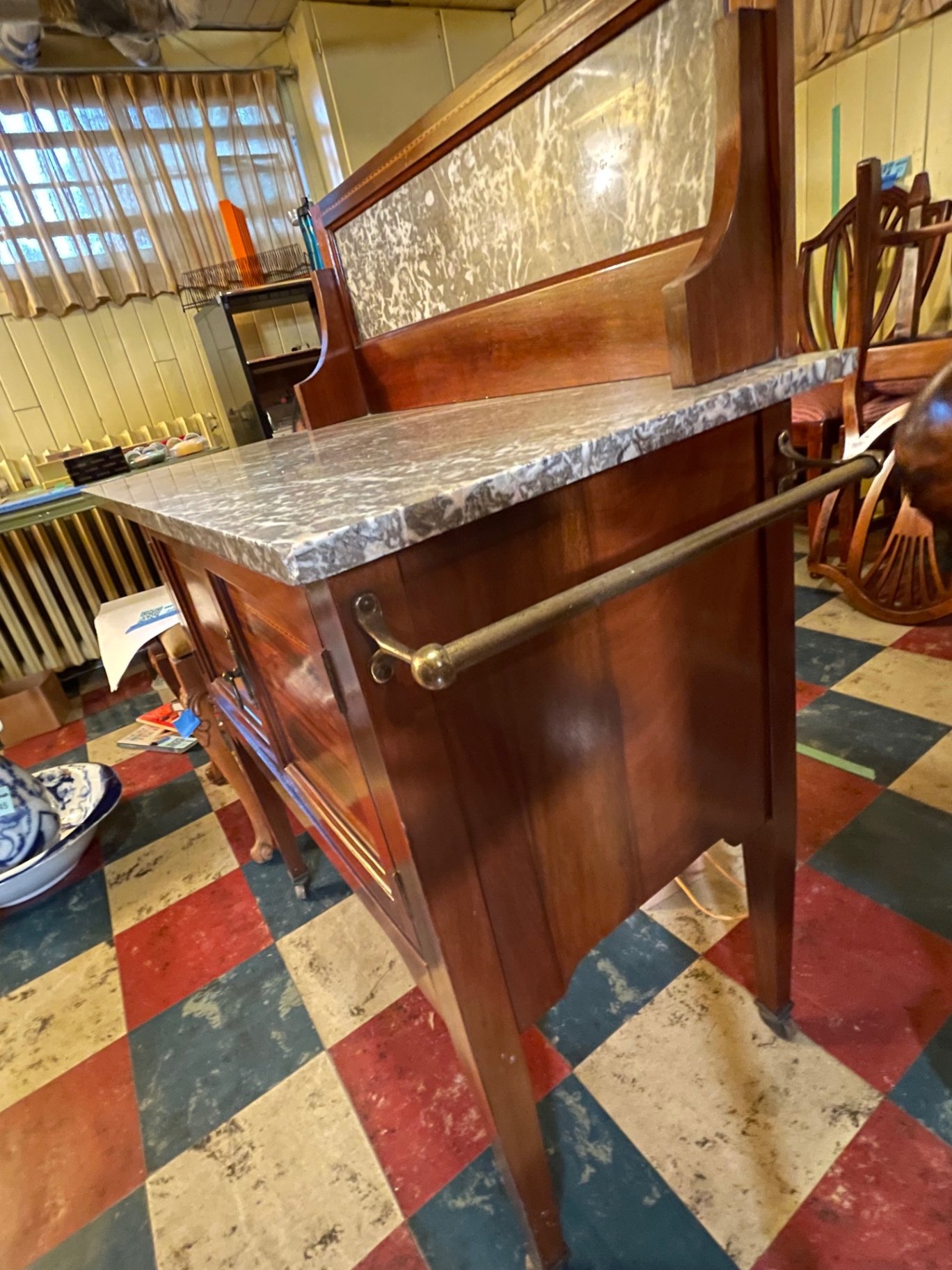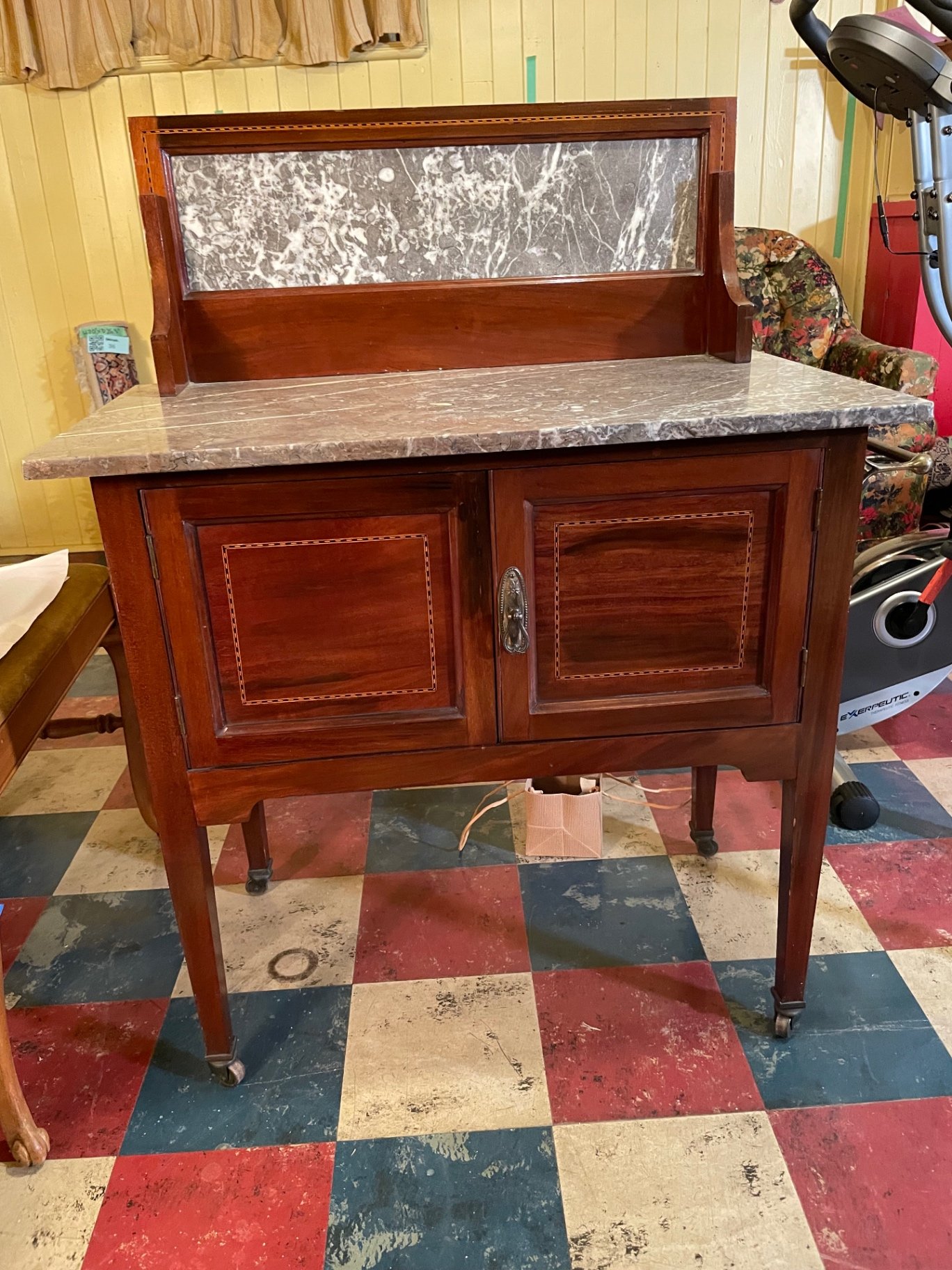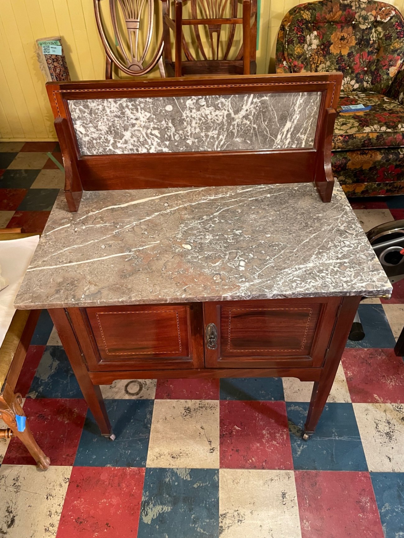 A vintage mahogany wash stand with a gray marble top and a matching marble back panel, featuring two paneled cabinet doors with decorative inlay, a central metal pull, and tapered legs with casters. Towel rail on side. The piece provides enclosed storage beneath the countertop. 30w x 17d x 40h. **HEAVY, BRING HELP TO MOVE OUT OF KITCHEN AND APPROPRIATE VEHICLE