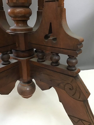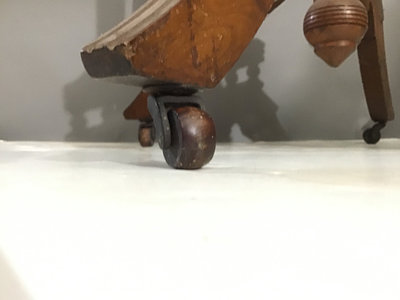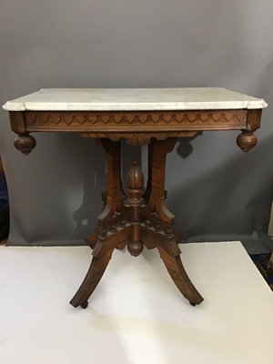 Occasional table, carved mahogany base with marble top on wooden casters. Table 30x21x30. Table missing 4th ball ornament on base. Heavy, bring help and appropriate vehicle to pickup. 1 piece.