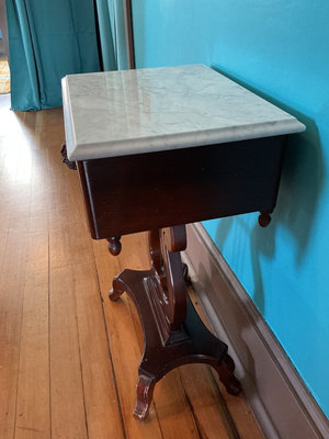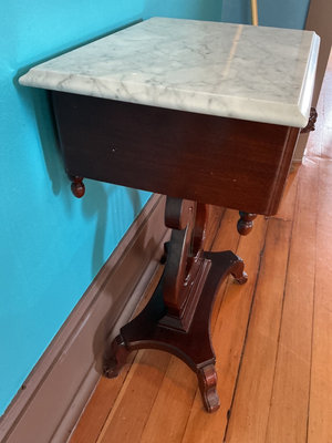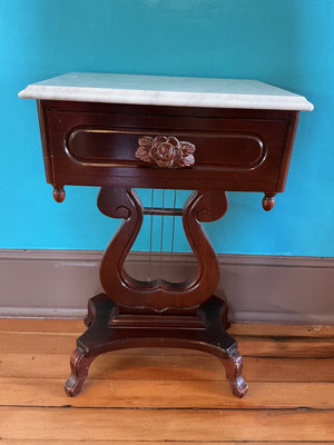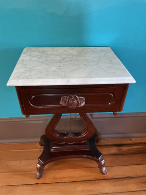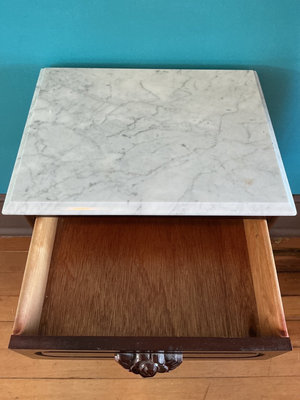 A dark wooden side table with a white marble top. It has one drawer with a carved rose motif on the front and a decorative pedestal base with curved supports and four feet. Marble top is not connected to base. 18.5 w x 14 d x 28 tall.