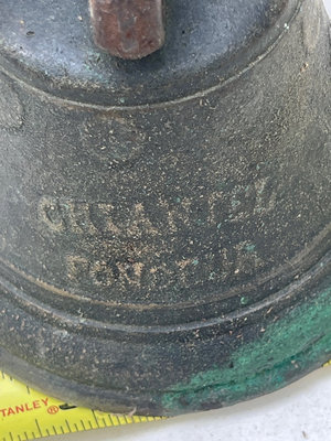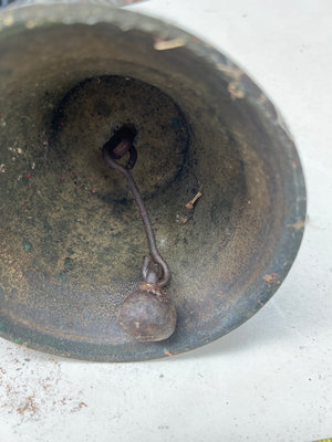 An antique dark metal bell with a rusted clapper inside and embossed markings including 1878 on the exterior. Located in garage.