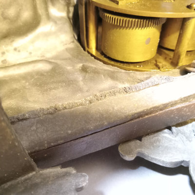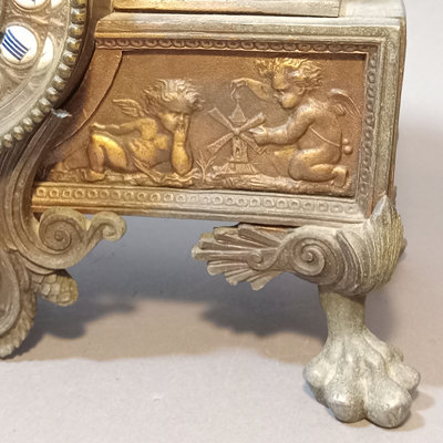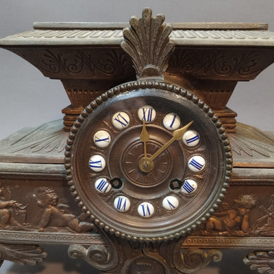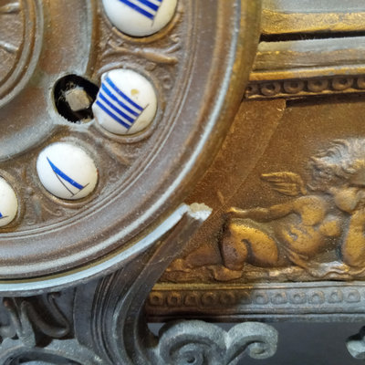 Heavy metal mantle clock, enamel numbers on face, includes key. Missing decorative elements on top/sides, along base. Untested. 11x6x8.25. 1 piece.