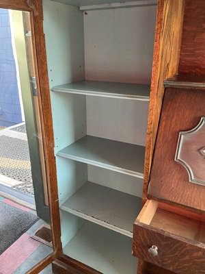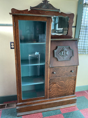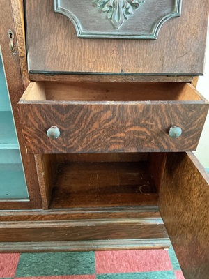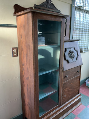 A tall oak cabinet featuring a glass-front display compartment, a side storage area with a decorative panel, multiple drawers, and an interior shelving section. 39.5 inches wide by 15 inches deep and 67 inches tall.