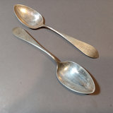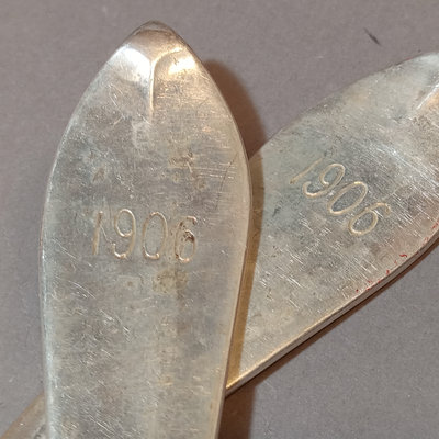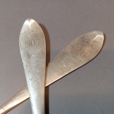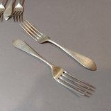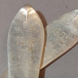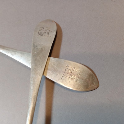 Antique P.L. Krider & Co. sterling silver flatware with "F.R. McI 1906" monogram on handles. Set of 12 forks overall 498.8dwt, and 2 serving spoons overall 81.1dwt. 14 pieces.
